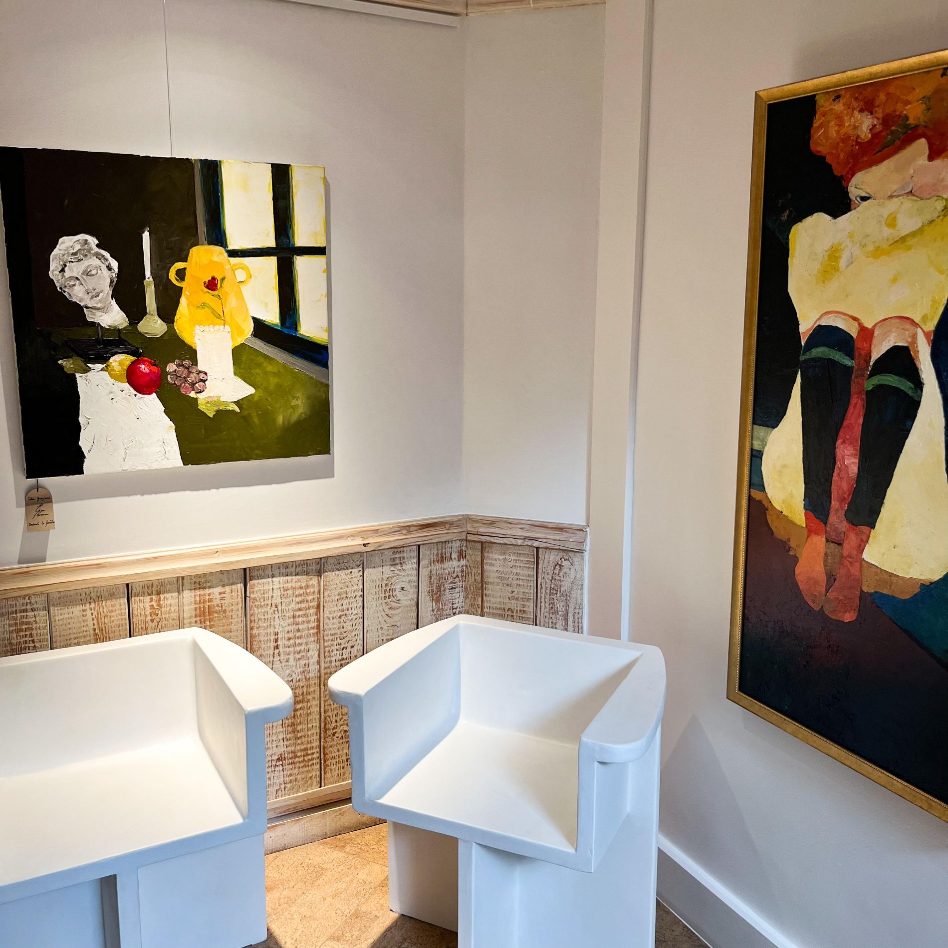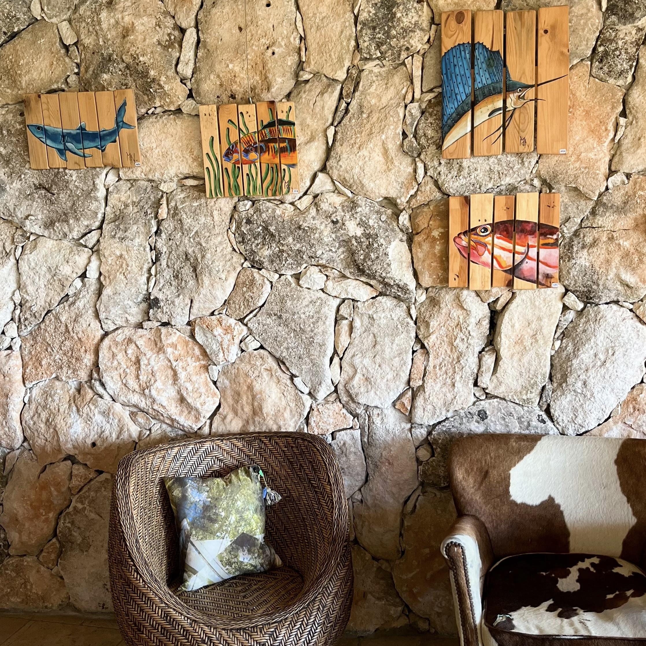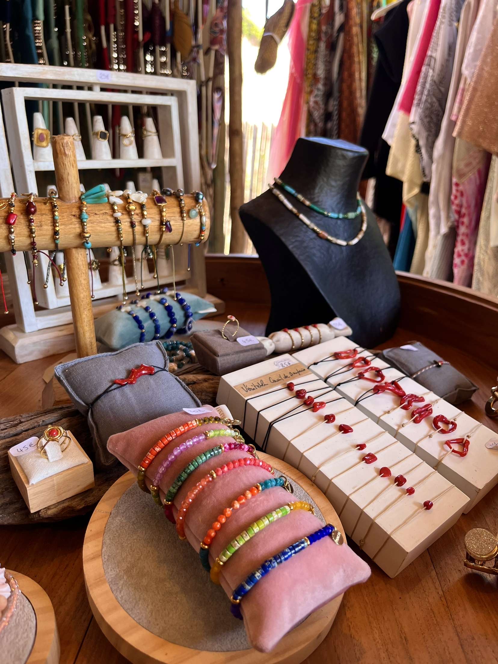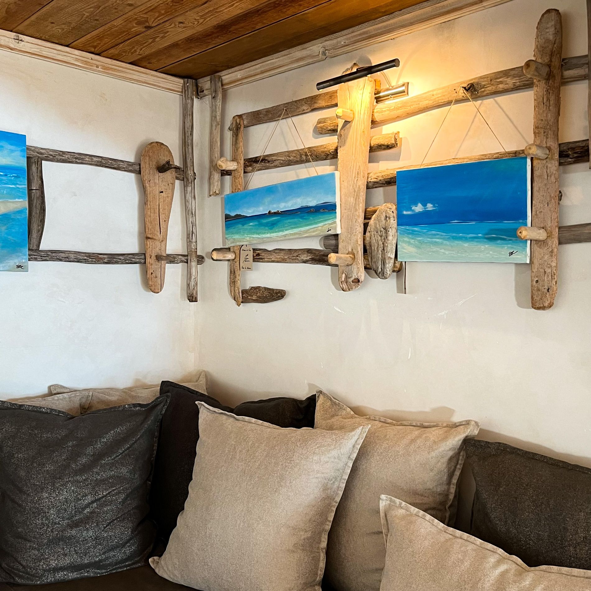 D’abord on s’autorise à flâner. A observer les murs sur lesquels sont exposées œuvres peintes, photographiées ou illustrées. On s’arrête un instant devant une vitrine exposant moult trésors. On pose son regard sur une sculpture « fatt’in Corsica »*. On arpente les jardins jusqu’à la paillotte où se trouve notre boutique. Et surtout, on se laisse entraîner dans l’univers de l’artiste ou de l’artisan. On détaille chaque création et on réfléchit : va-t-on sauter le pas ? Avant de vous décider, sachez une chose : à l’hôtel U Capu Biancu, le shopping revêt une tout autre dimension.