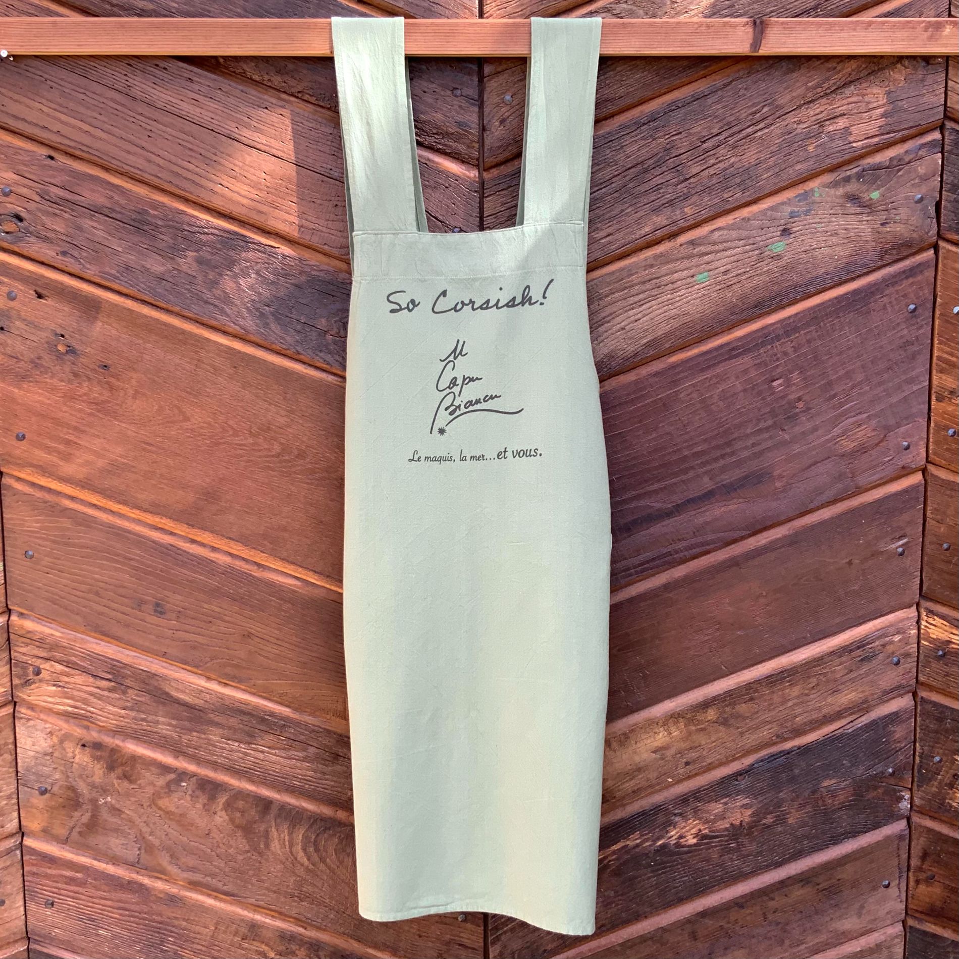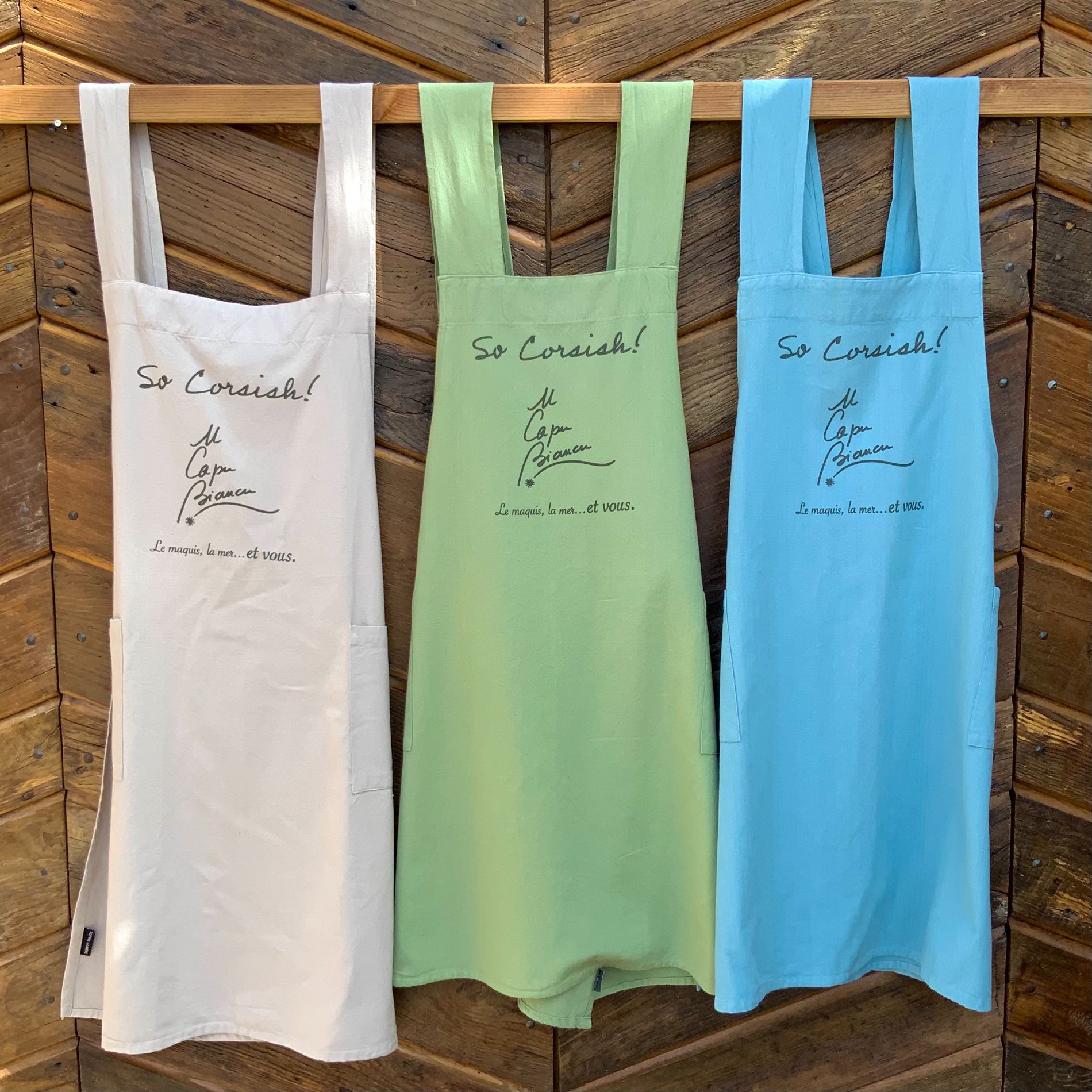 Un tablier japonais contemporain, fabriqué en toile de coton et personnalisé aux couleurs de l’hôtel, entre la mer et le maquis.