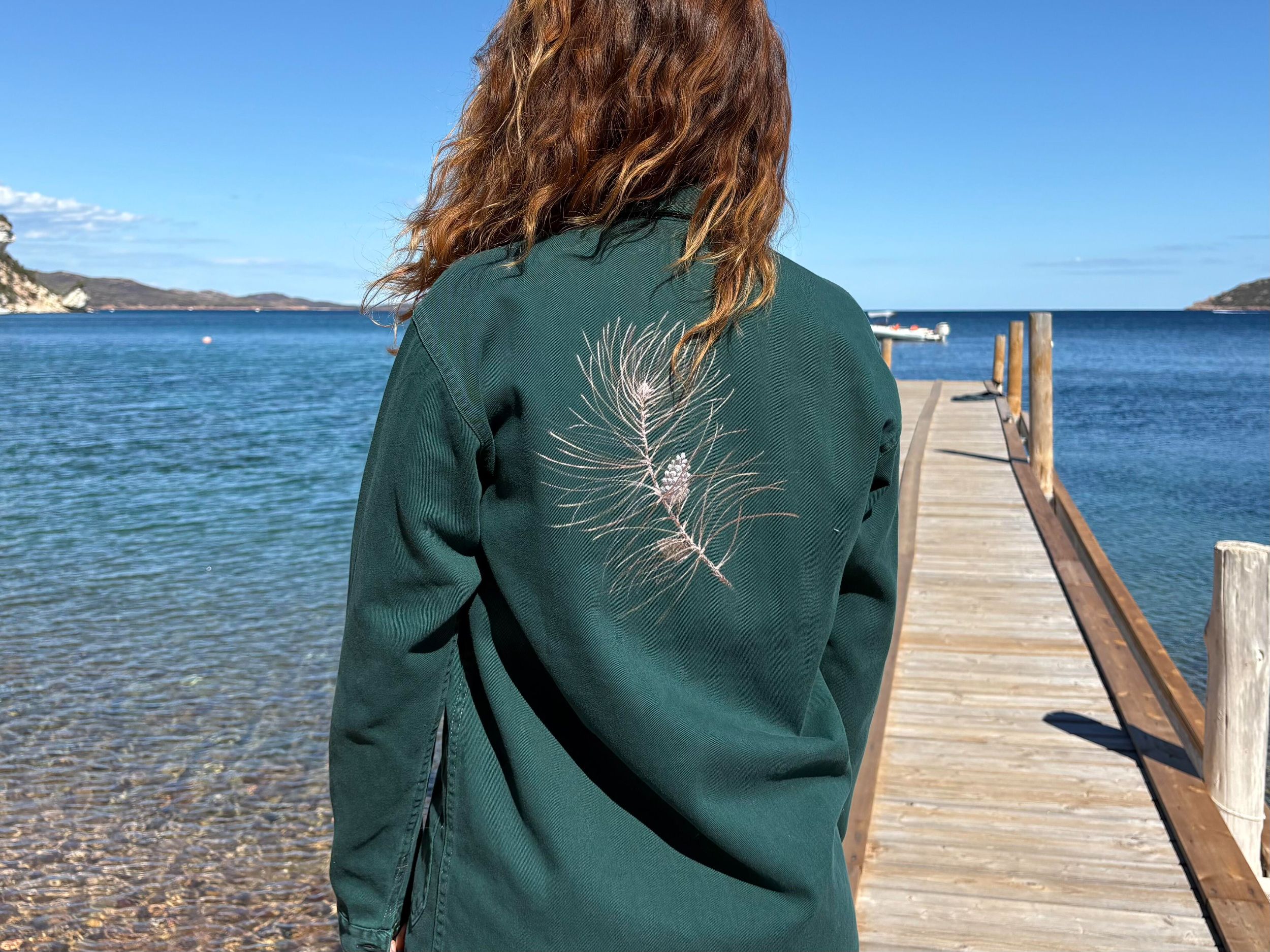 Au dos de cette veste en coton, l’artiste Dana a laissé parler ses rêves, inspirés par les éléments naturels emblématiques de la région de Bonifacio.