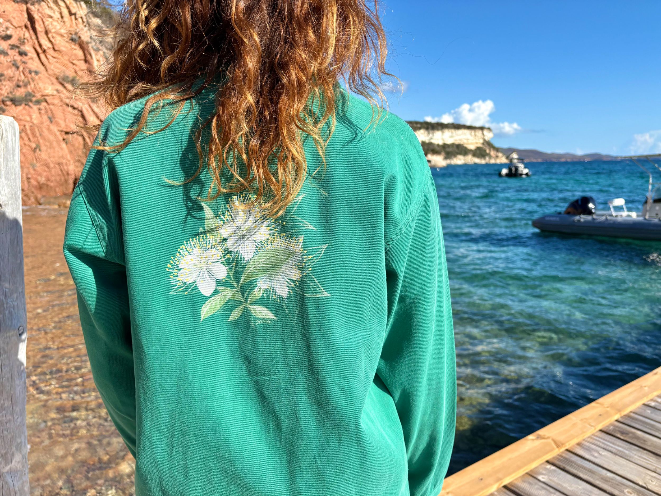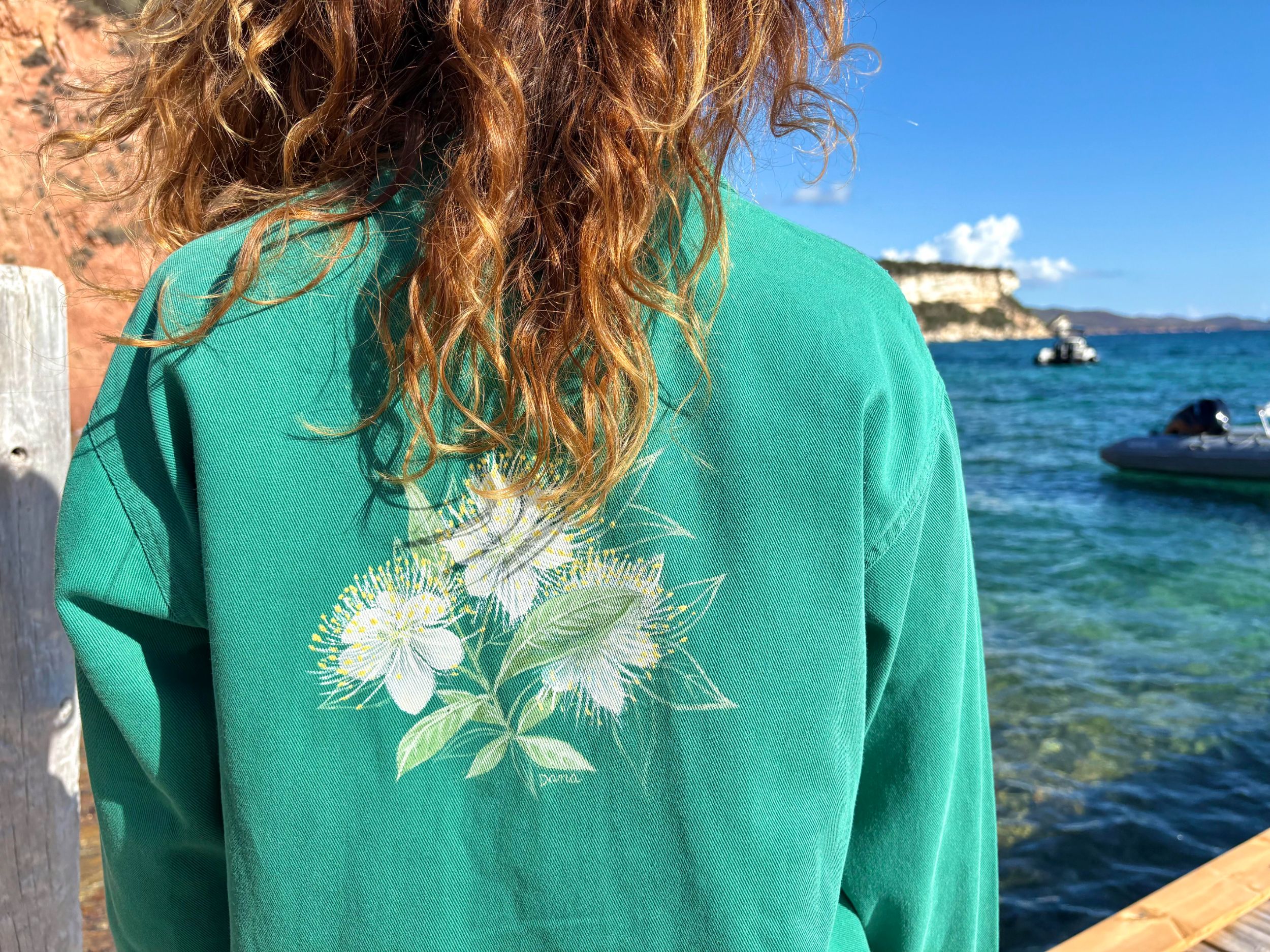 Au dos de cette veste en coton, l’artiste Dana a laissé parler ses rêves, inspirés par les éléments naturels emblématiques de la région de Bonifacio.